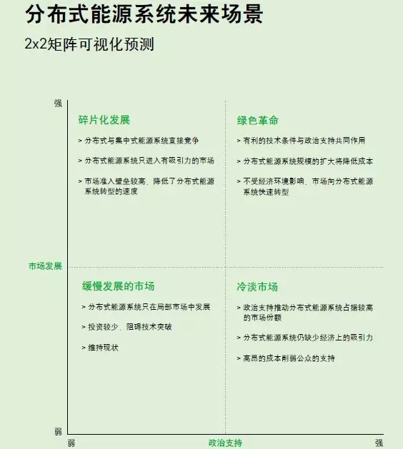 我們利用矩陣分析,從市場發(fā)展和政治影響兩個層面對“發(fā)展趨勢”和“關(guān)鍵不確定因素”進(jìn)行總結(jié),明確了歐洲分布式能源的13項關(guān)鍵不確定因素和16大發(fā)展趨勢,最終構(gòu)建出四種市場場景。