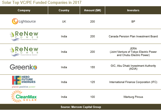 其中,單筆金額最大的VC/PE交易是LightsourceRenewableEnergy簽署的2億美元交易。此外,ReNewPower還簽署了兩單分別達(dá)到2美元的融資協(xié)議。其次是GreenkoEnergy,融資1.55億美元,HeroFutureEnergies籌資1.25億美元,CleanMaxSolar籌資1億美元。在2017年六大太陽(yáng)能風(fēng)險(xiǎn)投資基金交易中有五個(gè)來(lái)自印度。