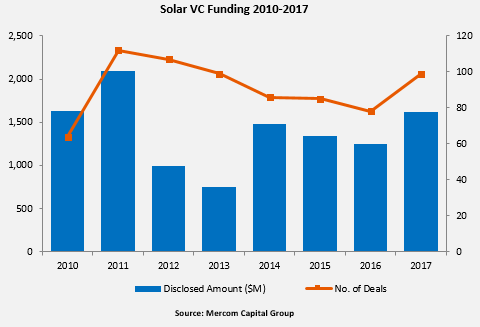 全球清潔能源通訊和咨詢公司Mercom資本日前發(fā)布2017年太陽(yáng)能行業(yè)融資和并購(gòu)活動(dòng)的年度報(bào)告稱,全球企業(yè)對(duì)太陽(yáng)能行業(yè)的融資總額達(dá)到128億美元,比2016年的91億美元增長(zhǎng)了41%,包括風(fēng)險(xiǎn)投資/私募股權(quán)(VC),債務(wù)融資和公共市場(chǎng)融資。