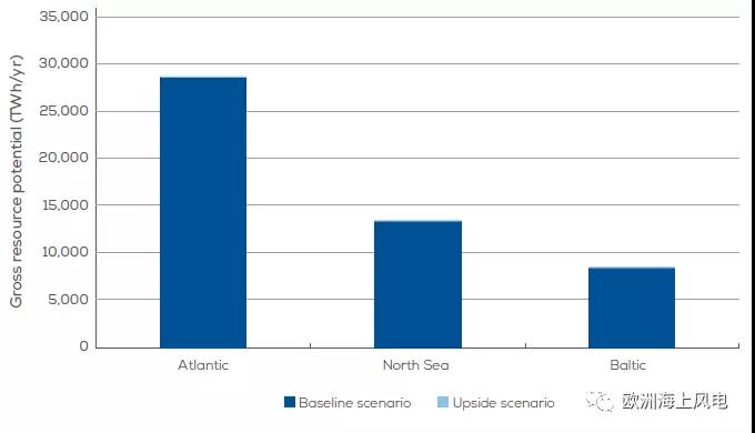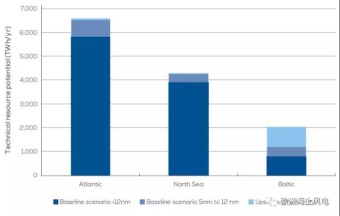歐洲各國從離岸5海里到專屬經(jīng)濟(jì)區(qū)(EEZ)的所有海域,除去已作他用的海域(如航道、漁區(qū)、軍事)和環(huán)境條件不可能作為海上風(fēng)場的海域所包含的風(fēng)能資源,按每平方公里5.36MW的密度計(jì)算。