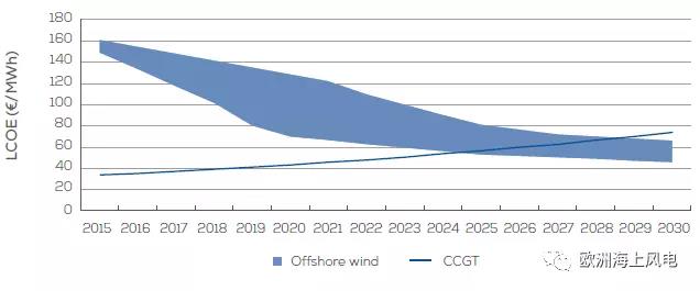 2015~2030年歐洲海上風(fēng)電和CCGT的LCOE趨勢預(yù)測