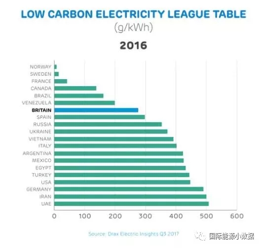 2012年英國發(fā)電碳排放強度在33個發(fā)達國家中排在第20位,僅僅5年以后英國在這個榜單上的排名升到第7位。在這么短的時間內(nèi)實現(xiàn)電力系統(tǒng)的低碳