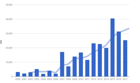2017年,燃煤電廠的發(fā)展連續(xù)第二年大幅下降,2015年至2017年新建筑業(yè)務(wù)下降73%,這主要得益于中國的緊縮政策和印度缺乏私人融資。