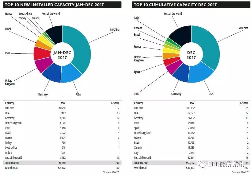 2018年4月25日,全球風能理事會發(fā)布《全球風電報告2017》。17年,全球風電新增裝機容量保持50GW以上,歐洲、印度和離岸部門實現了歷史性增長。中國新增風電裝機容量有所回落,即19.66GW,為全球新增裝機容量的不到一半。2017年全球新增裝機容量為52,492MW,累計裝機容量達到539,123MW。與2016年新增裝機容量(54,642MW)相比,同比下滑3.8%;累計裝機容量與2016年底(487,279MW)相比增長11%。