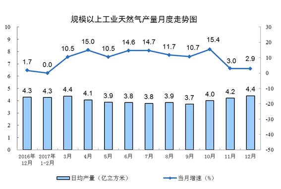隨著煤炭減量替代政策的實(shí)施、“煤改氣”工程的推進(jìn),國(guó)內(nèi)天然氣消費(fèi)需求量持續(xù)攀高,12月份,天然氣產(chǎn)量136.1億立方米,月產(chǎn)量為歷史新高,同比增長(zhǎng)2.9%,增速與11月份基本持平;日均生產(chǎn)4.4億立方米,比11月份增加0.2億立方米。1-12月份,天然氣產(chǎn)量1474.2億立方米,同比增長(zhǎng)8.5%。