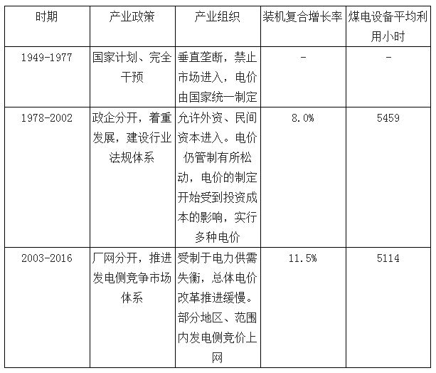我國電力工業(yè)的發(fā)展可以劃分為三個階段:第一階段為1949-1977 年,計劃經(jīng)濟嚴格控制時期,此時電力工業(yè)呈現(xiàn)垂直壟斷的特征。第二階段為1978-2002 年,體制改革、市場管理時期,電力裝機呈現(xiàn)8.0%的復(fù)合增長率。第三階段為2003-2016 年,競爭市場時期,電力裝機復(fù)合增速提升至11.5%。