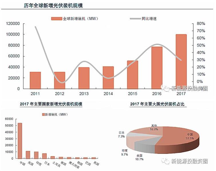 近年全球光伏的發(fā)展勢頭相比風(fēng)電更為強勁,整體呈現(xiàn)較快增長趨勢,尤其近三年增速均超過20%。2017年全球新增光伏裝機99.1GW,同比增長29.4%,創(chuàng)歷年新高。