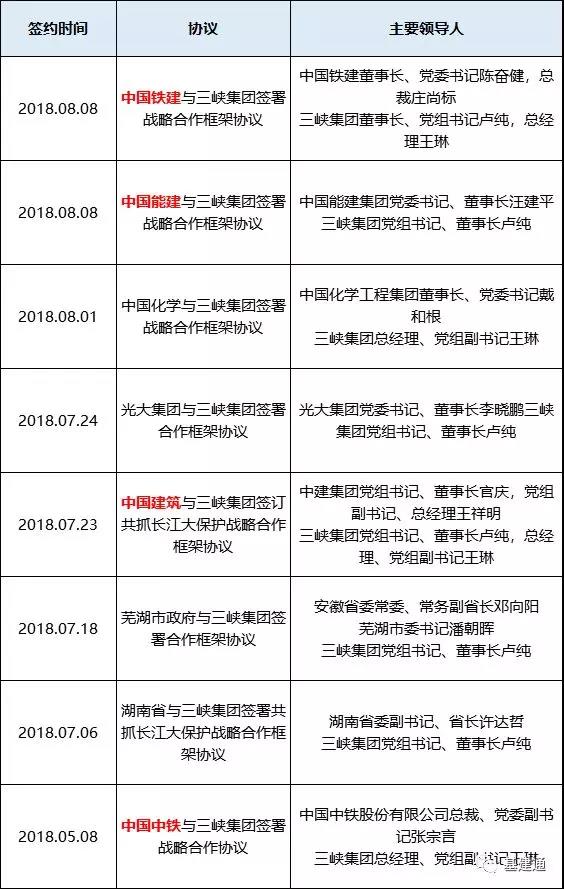 從7月到現(xiàn)在,僅一個月左右的時間里,三峽集團就簽約了7份戰(zhàn)略合作框架協(xié)議,其中有3家建筑央企:中國建筑、中國鐵建、中國能建,加上此前與中國中鐵、中國電建簽署的合作協(xié)議,已經(jīng)有5家建筑央企巨頭和三峽集團確定了合作。