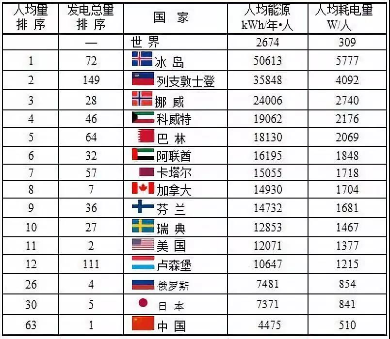 人均能源消費(fèi)量和人均耗電量在一定程度上反映一個(gè)國(guó)家或地區(qū)經(jīng)濟(jì)發(fā)展水平和人民生活水平。根據(jù)美國(guó)中央情報(bào)局2016年的數(shù)據(jù),人均能源消費(fèi)量和人均耗電量最多的國(guó)家是冰島和列支敦士登。雖然中國(guó)電力產(chǎn)量居世界首位,但由于人口基數(shù)巨大,人均能源消耗量?jī)H居世界第63位,處于落后位置。
