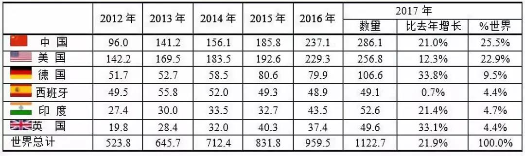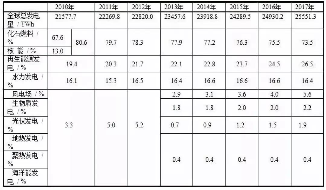 從表中看出,截止2017年全球再生能源發(fā)電占電力總量的26.5%,比2016年增加2%,也是增幅最大的一年。其中光伏發(fā)電和風(fēng)電場(chǎng)增幅最高。
