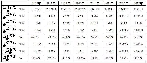 2010~2017年全球電力生產(chǎn)結(jié)構(gòu)