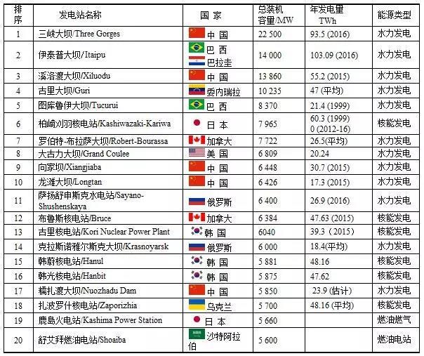 在世界上前20位發(fā)電站中,中國(guó)水力發(fā)電占有5席,均為水力發(fā)電。世界上最大的20座發(fā)電站每年都有所變動(dòng),加拿大羅伯特-布拉薩大壩從原有的第17位沖到第7位;韓國(guó)古里核電站發(fā)展壓水反應(yīng)堆也沖入第13位,超過(guò)本國(guó)的韓蔚核電站和韓光核電站。另外值得注意的是燃煤發(fā)電和燃?xì)獍l(fā)電已經(jīng)踢出前20強(qiáng)了。水力發(fā)電和核能發(fā)電均屬清潔能源發(fā)電,獨(dú)霸前20強(qiáng),化石燃料發(fā)電的地位逐步降低。
