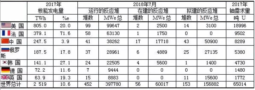 2018年7月主要國(guó)家核反應(yīng)堆及鈾需求