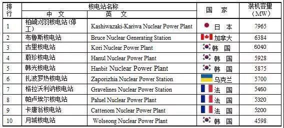世界上最大的核電站是日本柏崎刈羽核電站,裝機(jī)容量為7965MW,但2011年已經(jīng)停工。值得注意的是韓國(guó)核電站進(jìn)展很快,前十位核電站就占有4席,把美國(guó)和日本都摔到后面。