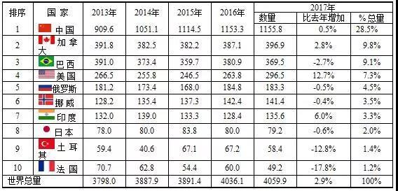水力發(fā)電量最多的國(guó)家(單位:TWh)
