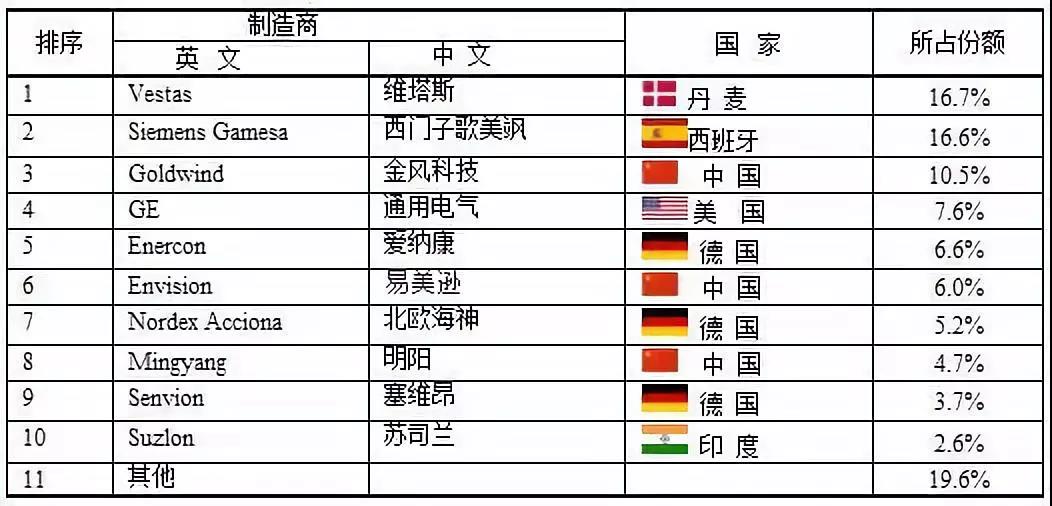 根據(jù)《Renewables 2018 Global Status Report,REN21》報(bào)告,風(fēng)輪機(jī)主要被西歐國(guó)家占領(lǐng),中國(guó)風(fēng)輪機(jī)制造商占全球份額的21.2%。