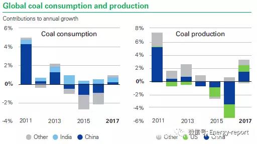 在幾年的“自由落體”之后,煤炭市場(chǎng)在去年迎來(lái)了一個(gè)“小陽(yáng)春”,全球煤炭的消費(fèi)量和產(chǎn)量同時(shí)增長(zhǎng)。全球煤炭的消費(fèi)量同比增長(zhǎng)了1%(2500萬(wàn)噸油當(dāng)量),而印度(4.8%,1800萬(wàn)噸油當(dāng)量)煤炭消費(fèi)實(shí)現(xiàn)了創(chuàng)紀(jì)錄的增長(zhǎng)。非常有趣的是,中國(guó)煤炭消費(fèi)(0.5%,400萬(wàn)噸油當(dāng)量)在3年連續(xù)下滑之后,出現(xiàn)了反彈。盡管在工業(yè)和民用部門(mén)實(shí)施了大幅度的煤改氣,中國(guó)能源需求的增長(zhǎng)也創(chuàng)造了額外的煤炭消費(fèi),作為能源平衡的補(bǔ)充。
