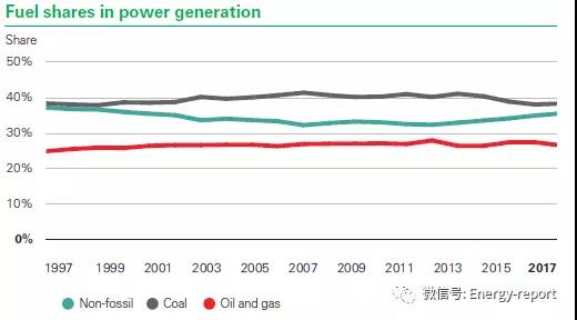 令人震驚的是:盡管近年來(lái)可再生能源大幅度增長(zhǎng),巨大的政策努力鼓勵(lì)煤炭像更清潔、低碳的燃料轉(zhuǎn)變,但是在近20年中電力部門(mén)的燃料結(jié)構(gòu)幾乎沒(méi)有改進(jìn)。1998年煤炭在電力部門(mén)的占比為38%—這與2017年的情況相同—小幅度的變化也是因?yàn)橹袊?guó)煤炭需求快速增長(zhǎng)的情況出現(xiàn)反轉(zhuǎn)而導(dǎo)致的。非化石燃料在2017年的占比實(shí)際上比20年前還有所降低,可再生能源的增長(zhǎng)并未抵消核電的下降。