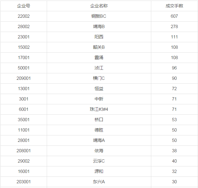 供應(yīng)方: 共51家參與,29家成交。參與掛牌36家, 掛牌2052手,掛牌電量205200 萬千瓦時(shí), 掛牌成交11家,成交283手,成交電量 28300 萬千瓦時(shí)。參與摘牌29家, 摘牌成交23家,成交1797手,成交電量 179700 萬千瓦時(shí)。