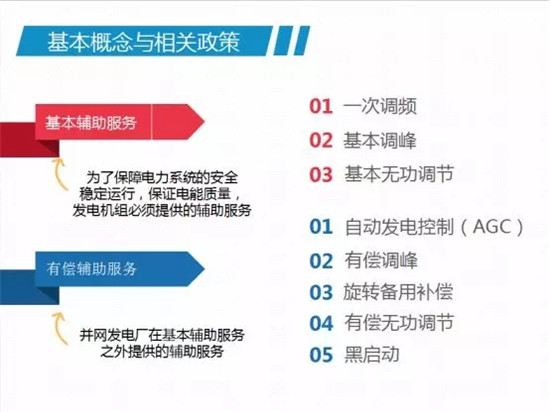 輔助服務(wù)是指為維護電力系統(tǒng)的安全穩(wěn)定運行,保證電能質(zhì)量,除正常電能生產(chǎn)、輸送、使用外,由發(fā)電企業(yè)、電網(wǎng)經(jīng)營企業(yè)和電力用戶提供的服務(wù),包括:一次調(diào)頻、自動發(fā)電控制(AGC)、調(diào)峰、無功調(diào)節(jié)、備用、黑啟動服務(wù)等。