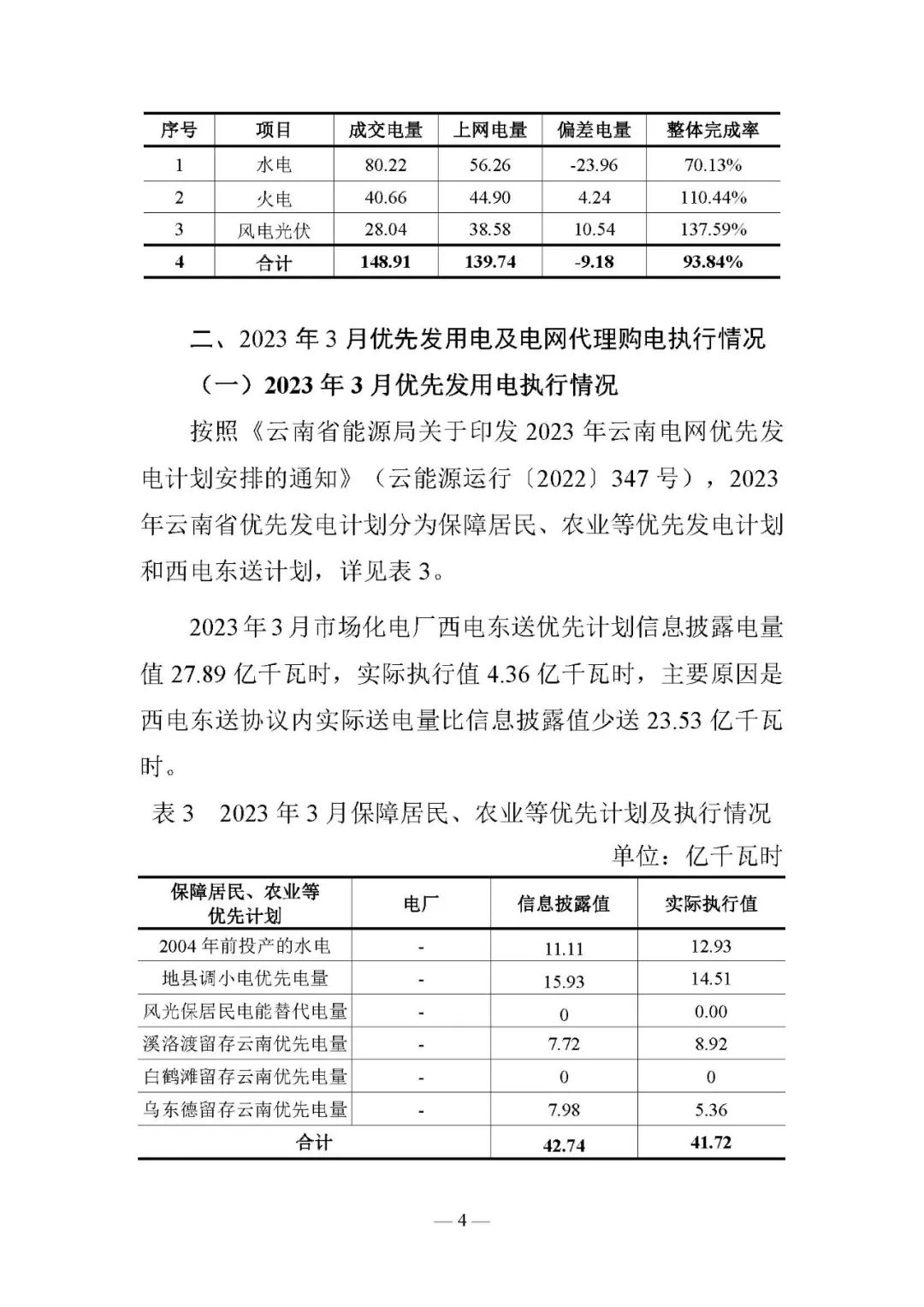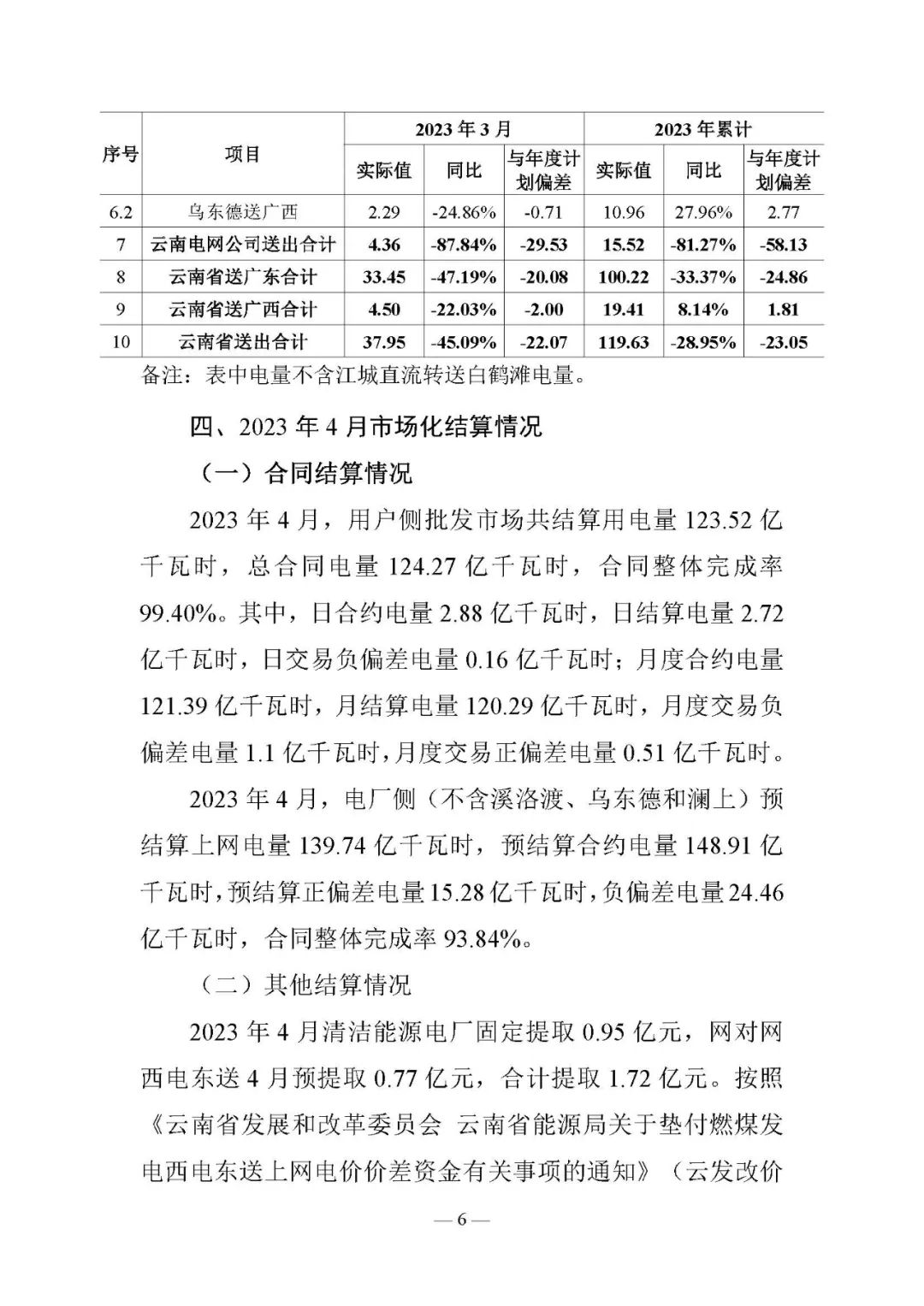 2023年5月,云南省內(nèi)市場化交易電量 139 81億千瓦時,同比減少 10 97%。其中省內(nèi)清潔能源直接交易電量99 42億千瓦時,平均成交價0 27487