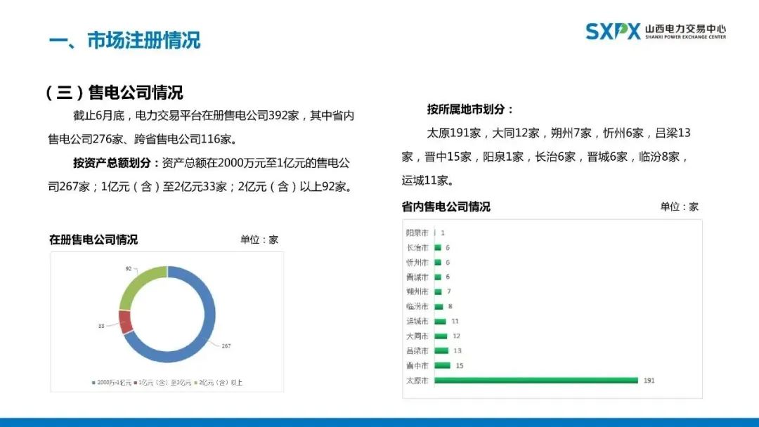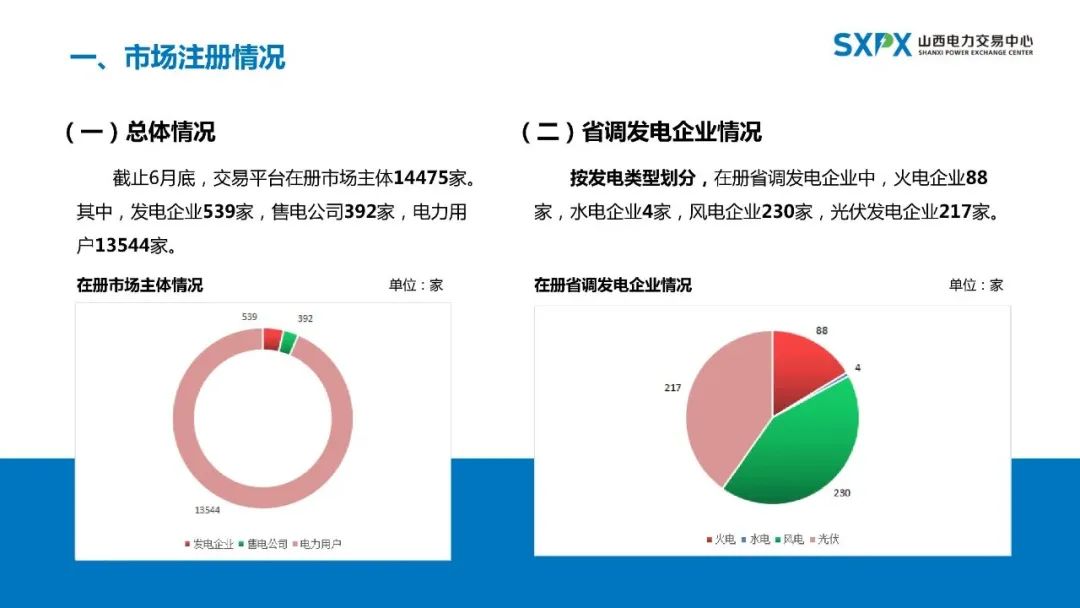 截止6月底交易平臺(tái)在冊(cè)市場(chǎng)主體14475家其中,發(fā)電企業(yè)539家,售電公司392家,電力用戶13544家。