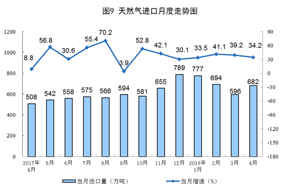 天然氣進(jìn)口連續(xù)7個月保持30%以上的高速增長。4月份,天然氣進(jìn)口682萬噸,同比增長34.2%,增速比上月回落5個百分點。1-4月份,進(jìn)口天然氣2742萬噸,同比增長36.4%。