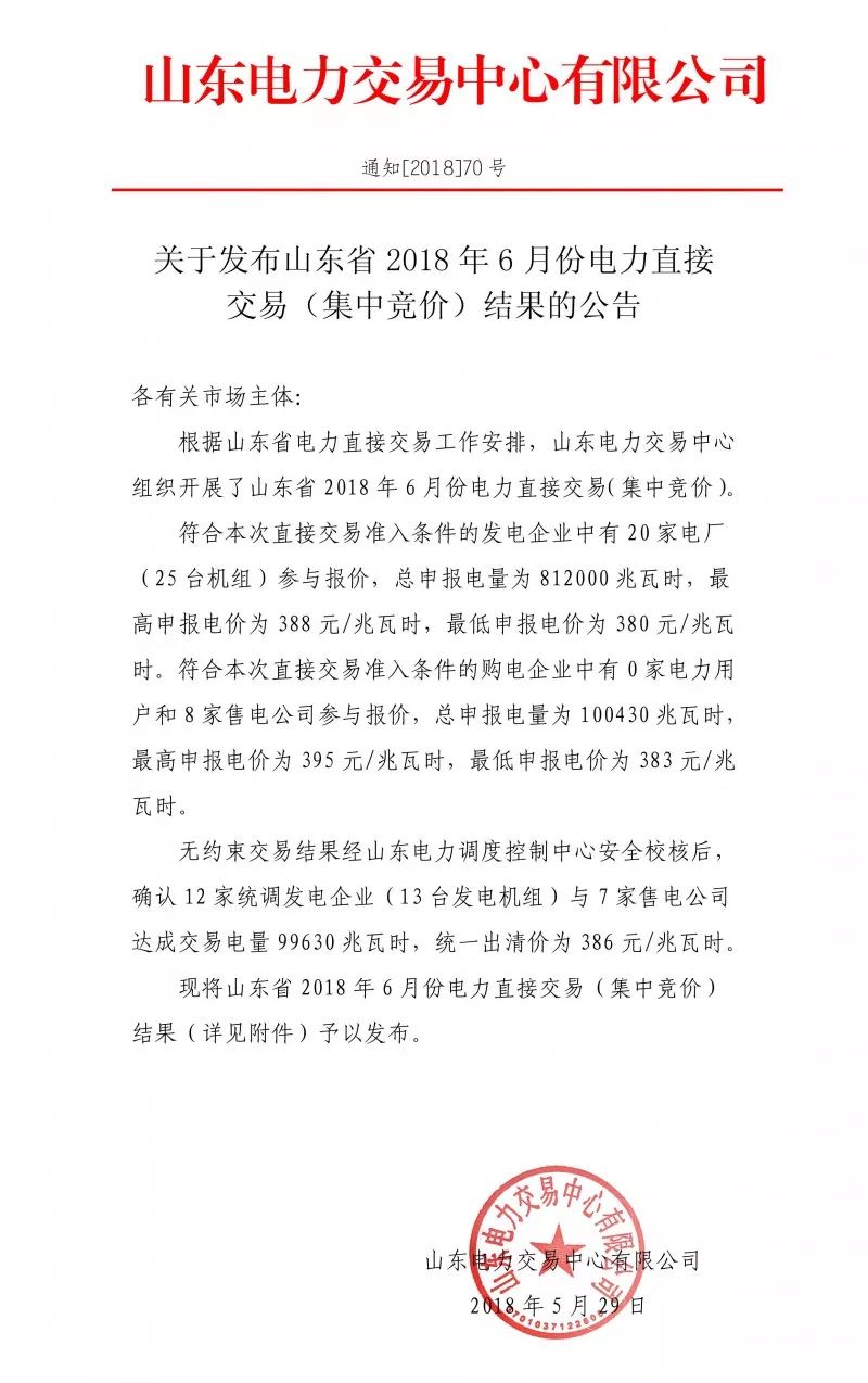 關于發(fā)布山東省2018年6月份電力直接交易(集中競價)結果的公告