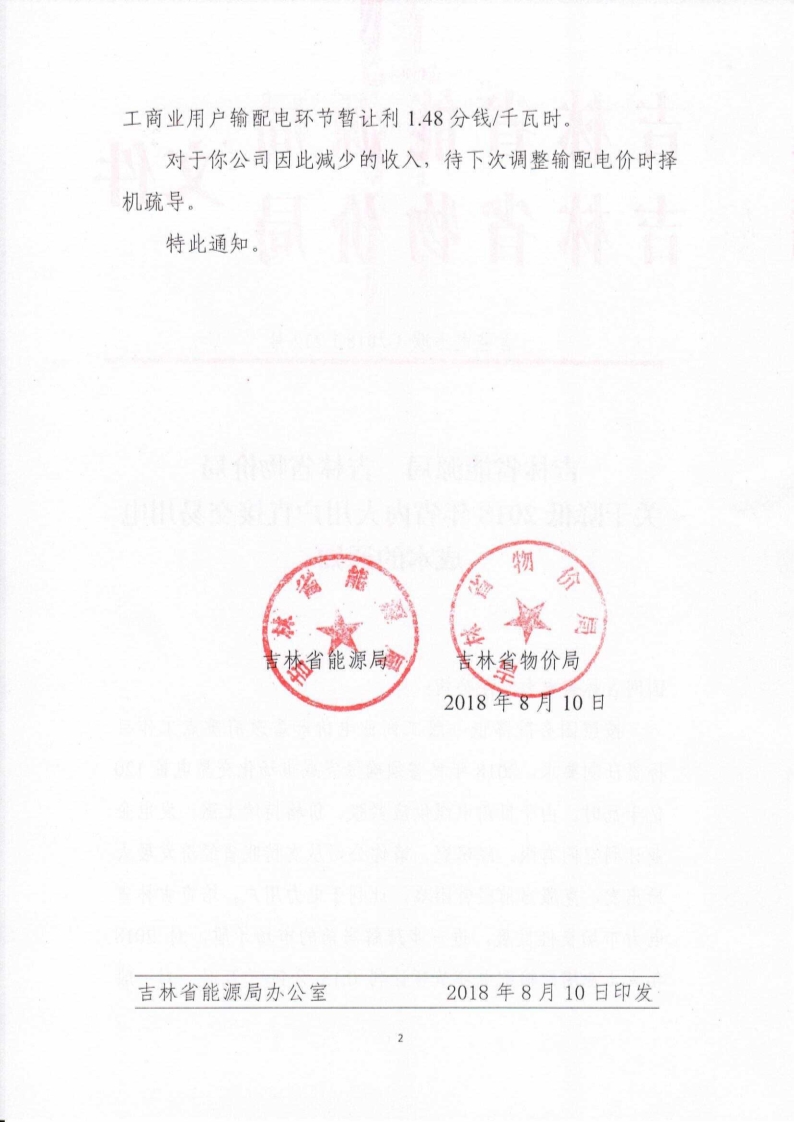 經(jīng)研究,讓利于電力用戶,培育吉林省電力市場良性發(fā)展,進(jìn)一步疏解當(dāng)前的市場矛盾,對(duì)2018年大工業(yè)用戶輸配電環(huán)節(jié)暫讓利0.13分錢/千瓦時(shí);對(duì)一般工商業(yè)用戶輸配電環(huán)節(jié)暫讓利1.48分錢/千瓦時(shí)。