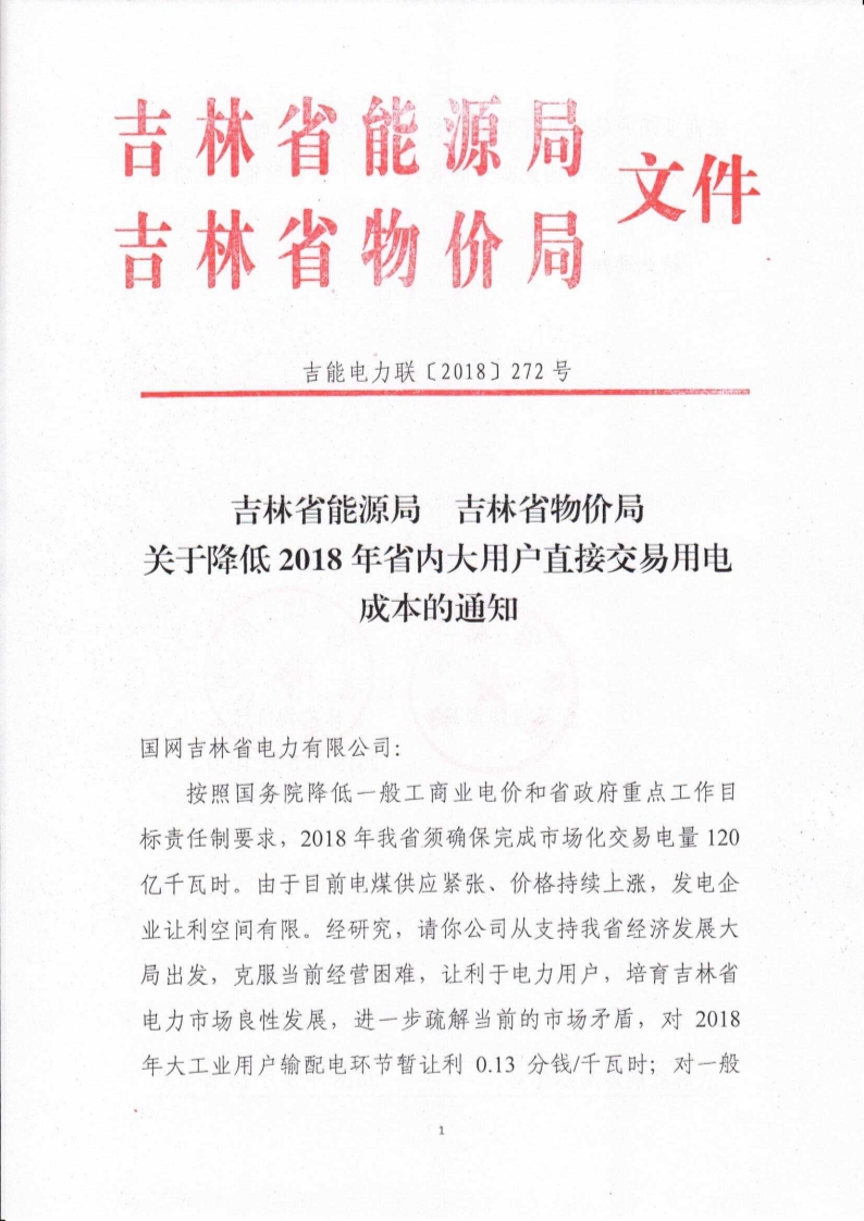 吉林省能源局吉林省物價(jià)局日前聯(lián)合發(fā)布了《吉林省能源局吉林省物價(jià)局關(guān)于降低2018年省內(nèi)大用戶直接交易用電成本的通知》,按照國務(wù)院降低一般工商業(yè)電價(jià)和省政府重點(diǎn)工作目標(biāo)責(zé)任制要求,2018年我省須確保完成市場化交易電量120億千瓦時(shí),由于目前電煤供應(yīng)緊張、價(jià)格持續(xù)上漲,發(fā)電企業(yè)讓利空間有限。經(jīng)研究,讓利于電力用戶,培育吉林省電力市場良性發(fā)展,進(jìn)一步疏解當(dāng)前的市場矛盾,對(duì)2018年大工業(yè)用戶輸配電環(huán)節(jié)暫讓利0.13分錢/千瓦時(shí);對(duì)一般工商業(yè)用戶輸配電環(huán)節(jié)暫讓利1.48分錢/千瓦時(shí)。詳情如下: