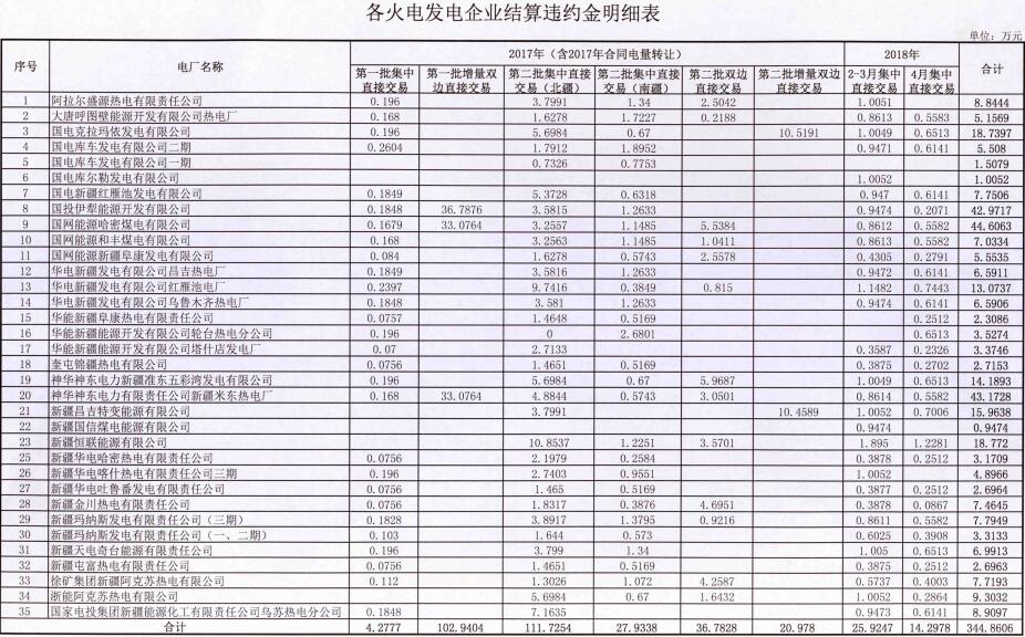 新疆結算與火電企業(yè)2017年及2018年2-4月月度交易違約金:總計344.86萬元