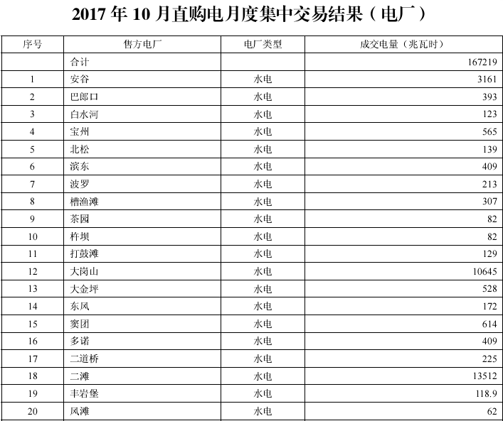 四川2017年10月份月度直購電及富余電量交易結(jié)果已公布