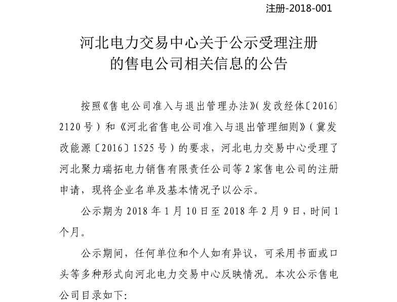 《河北電力交易中心關(guān)于公示受理注冊(cè)的售電公司相關(guān)信息的公告》(注冊(cè)-2018-001)