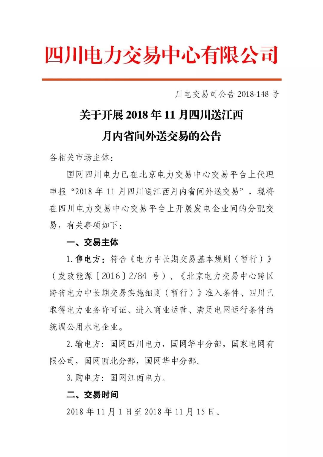 公告| 關于開展2018年11月四川送江西月內省間外送交易的公告