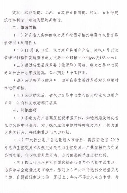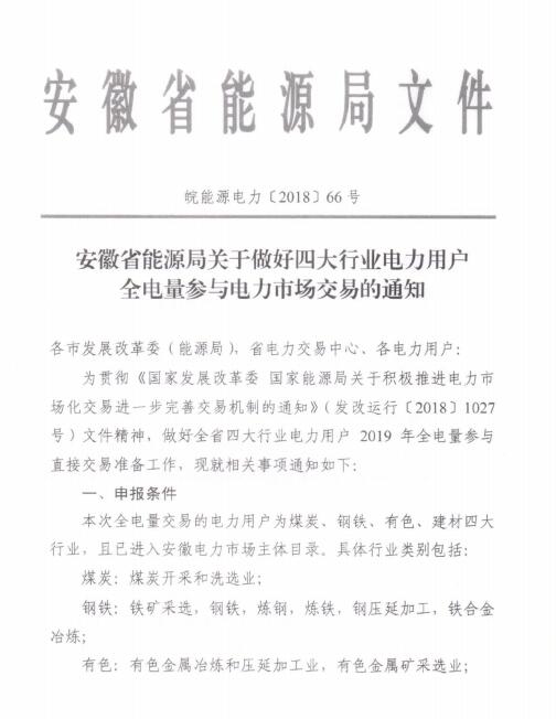 安徽省能源局日前發(fā)布了《關(guān)于做好四大行業(yè)電力用戶全電量參與電力市場交易的通知》,規(guī)定四大行業(yè)用戶全電量進(jìn)入市場后,需按安徽省2019年電力直接交易相應(yīng)規(guī)定開展電力直接交易,嚴(yán)禁虛報電力交易合同電量,市場電量月結(jié)月清,合同偏差按季度進(jìn)行處罰。