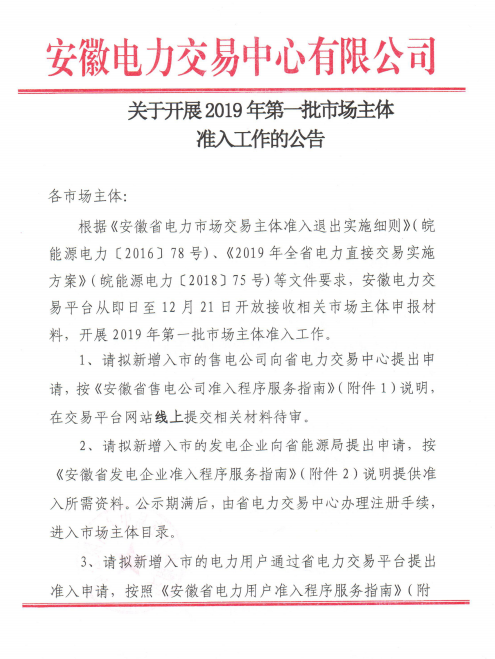 安徽電力交易中心日前發(fā)布了《關(guān)于開(kāi)展2019年第一批市場(chǎng)主體準(zhǔn)入工作的通知》,安徽電力交易平臺(tái)從即日起至12月21日開(kāi)放接收相關(guān)市場(chǎng)主體申報(bào)材料,開(kāi)展2019年第一批市場(chǎng)主體準(zhǔn)入工作。