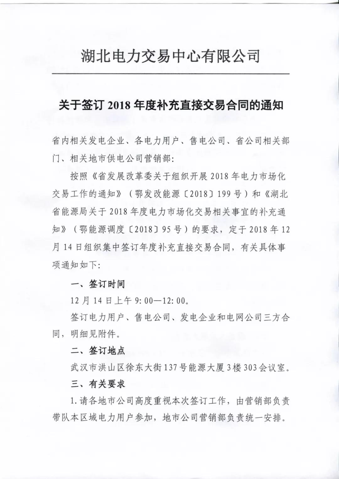 湖北關(guān)于簽訂2018年年度補充直接交易合同的通知