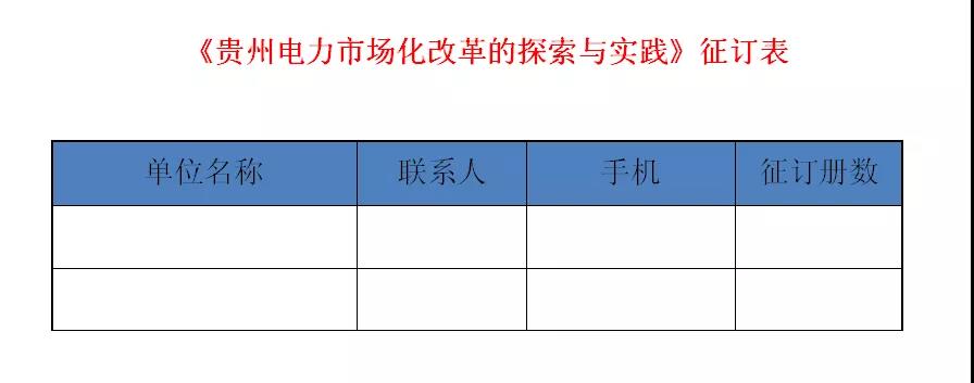 ▼《貴州電力市場化改革的探索與實踐》由各單位根據(jù)自身實際需要進(jìn)行征訂,貴州電力交易中心統(tǒng)一付費(fèi)。請各單位匯總征訂數(shù)量,于4月18日前將征訂表(見附件)通過電子郵箱報送至貴州電力交易中心。