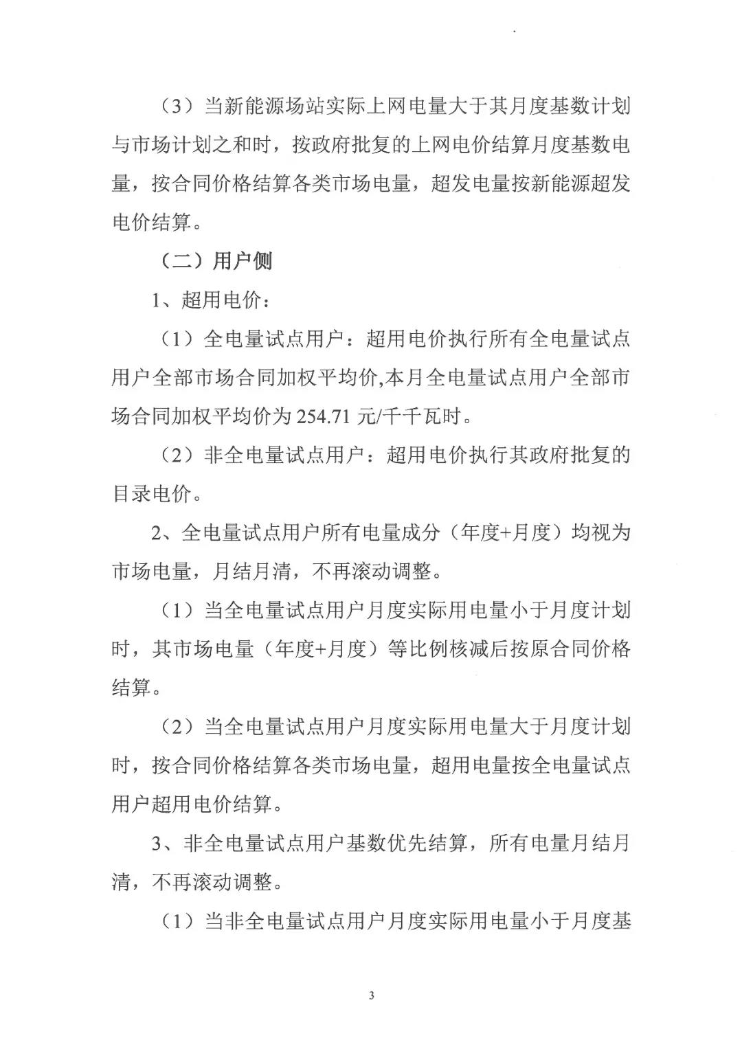 全電量試點(diǎn)用戶:超用電價(jià)執(zhí)行所有全電量試點(diǎn)用戶全部市場合同加權(quán)平均價(jià),本月全電量試點(diǎn)用戶全部市場合同加權(quán)平均價(jià)為254.71元/千千瓦時(shí)。