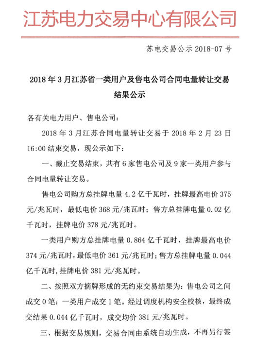 江蘇電力交易中心日前發(fā)布了《2018年3月江蘇省一類用戶及售電公司合同電量轉(zhuǎn)讓交易結(jié)果公示》,按照雙方摘牌形成的無(wú)約束交易結(jié)果為:售電公司之間成交0筆,一類用戶成交1筆,最終成交結(jié)果0.044億千瓦時(shí),成交均價(jià)381元/兆瓦時(shí)。詳情如下: