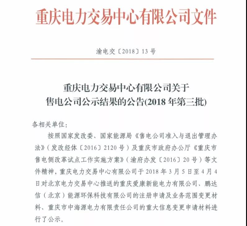 重慶新公示北京推送的3家售電公司 另有3家售電公司通過公示