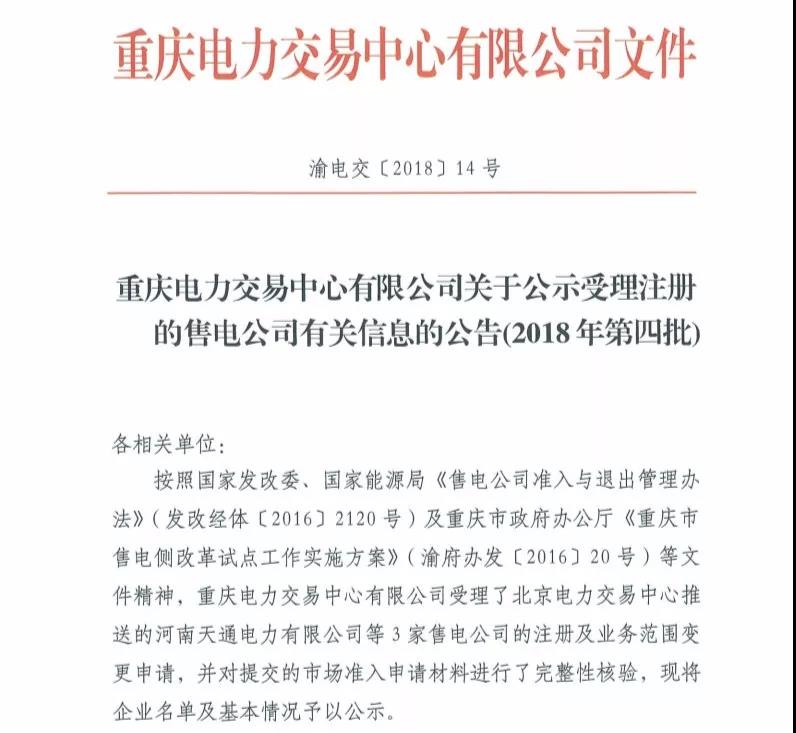 此外,在重慶電力交易中心《關(guān)于公示受理注冊的售電公司有關(guān)信息的公告(2018年第四批)》,受理了北京電力交易中心推送的河南天通電力有限公司等3家售電公司的注冊及業(yè)務(wù)范圍變更申請。公示期為2018年4月5日至5月4日,共1個月。