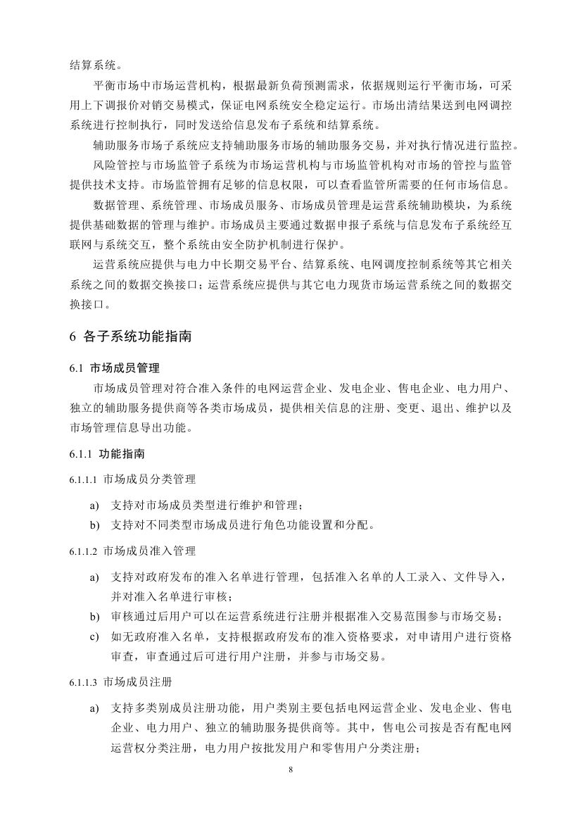 一、第一批8個現(xiàn)貨試點地區(qū),根據(jù)經(jīng)專家論證后的電力現(xiàn)貨市場試點方案和運營規(guī)則,參照《功能指南》,結(jié)合實際,制定電力市場運營系統(tǒng)現(xiàn)貨交易和現(xiàn)貨結(jié)算具體功能要求和系統(tǒng)建設(shè)方案,履行有關(guān)程序后實施。條件較成熟的非現(xiàn)貨試點地區(qū),可結(jié)合實際,參照《功能指南》,研究推動相關(guān)工作。結(jié)合現(xiàn)貨試點地區(qū)探索實踐,國家發(fā)展改革委、國家能源局將及時總結(jié)完善《功能指南》,適時推動出臺相關(guān)標(biāo)準(zhǔn)。