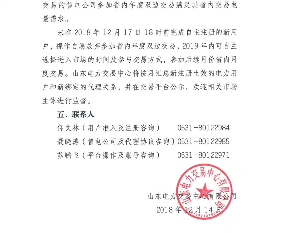 山東電力交易中心日前發(fā)布了《關(guān)于開展2019年新增電力市場交易用戶自主注冊及售電公司與電力用戶代理關(guān)系綁定工作的通知》,參加省內(nèi)年度雙邊交易的新用戶,應在2018年12月17日18時前完成自主注冊。