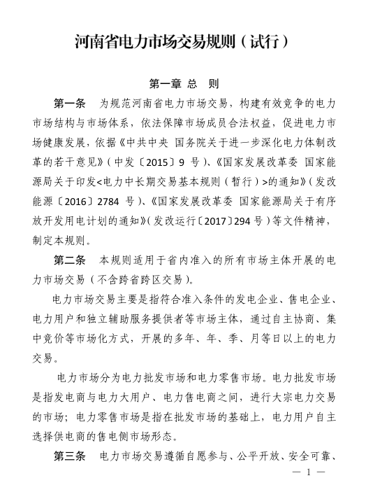 河南省日前發(fā)布了《河南省電力市場(chǎng)交易規(guī)則(試行)》