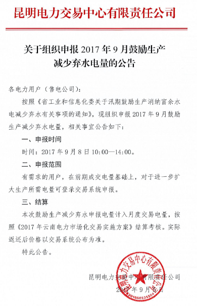云南組織申報(bào)2017年9月鼓勵(lì)生產(chǎn)減少棄水電量(公告)