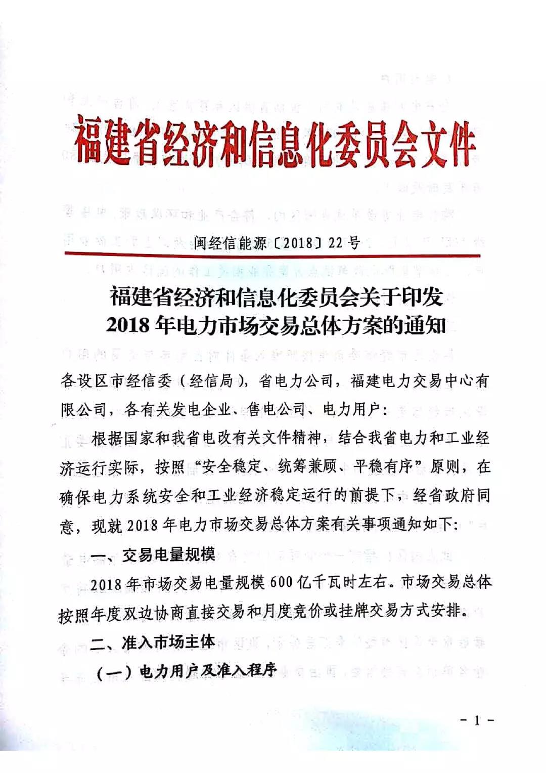 福建2018年電力市場交易總體方案敲定:規(guī)模600億千瓦時