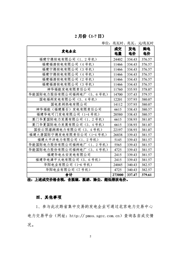 二、發(fā)電企業(yè)投標(biāo)及成交情況:有15家福建發(fā)電企業(yè)24個(gè)交易單元直接通過(guò)交易平臺(tái)參與投標(biāo),發(fā)電企業(yè)總投標(biāo)電量為2.94億千瓦時(shí)。福建電網(wǎng)剩余送出能力2月1日-2日為150萬(wàn)千瓦、2月3日-7日為200萬(wàn)千瓦,根據(jù)交易規(guī)則最終14家發(fā)電企業(yè)均中標(biāo),總成交電量為2.73億千瓦。原文如下:
