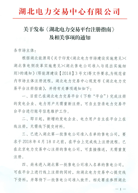 湖北電力交易中心日前發(fā)布了《湖北電力交易平臺注冊指南》及相關(guān)事項(xiàng)的通知,已進(jìn)入湖北第一批售電公司準(zhǔn)入名單的售電公司,要求于2018年4