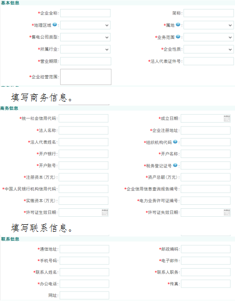 進(jìn)入市場成員基本信息菜單后,填寫基本信息?;拘畔⒅衅髽I(yè)經(jīng)營范圍應(yīng)包括“售電”或“電力銷售”。